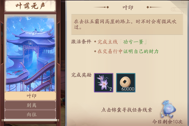 新笑傲江湖手游在五霸冈叶落无声叶印这个奇遇的第一个条件,就是需要玩家在交易行里面证明自己的财力,那么这个需要在交易行里面花费多少银子才算完成呢?很多玩家找不到这个具体的位...